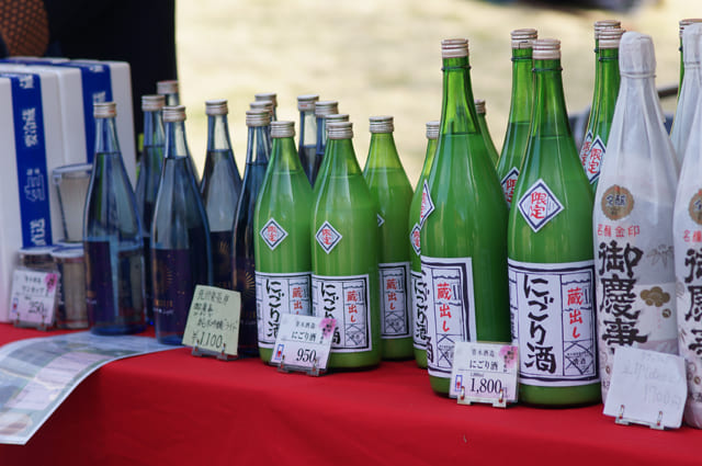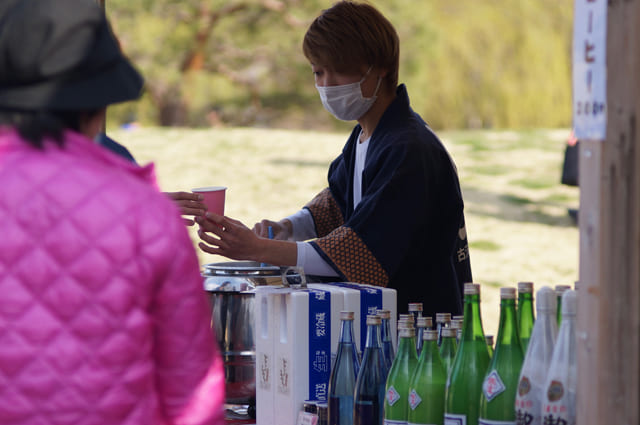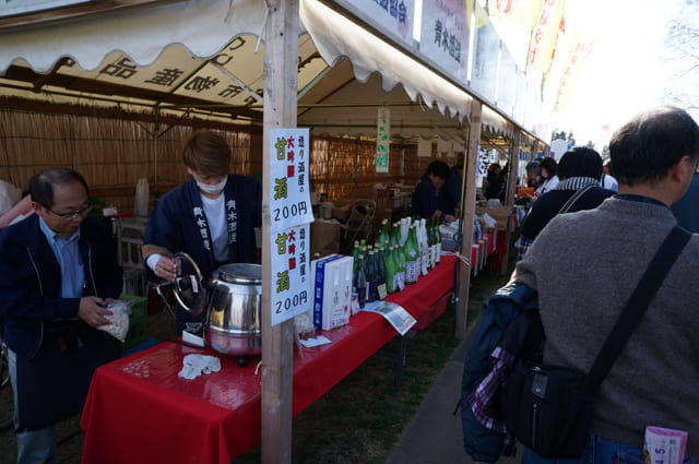 青木酒造では、桃祭りの県内物産の屋台に出展し、日本酒の販売と甘酒のふるまいを行いました。