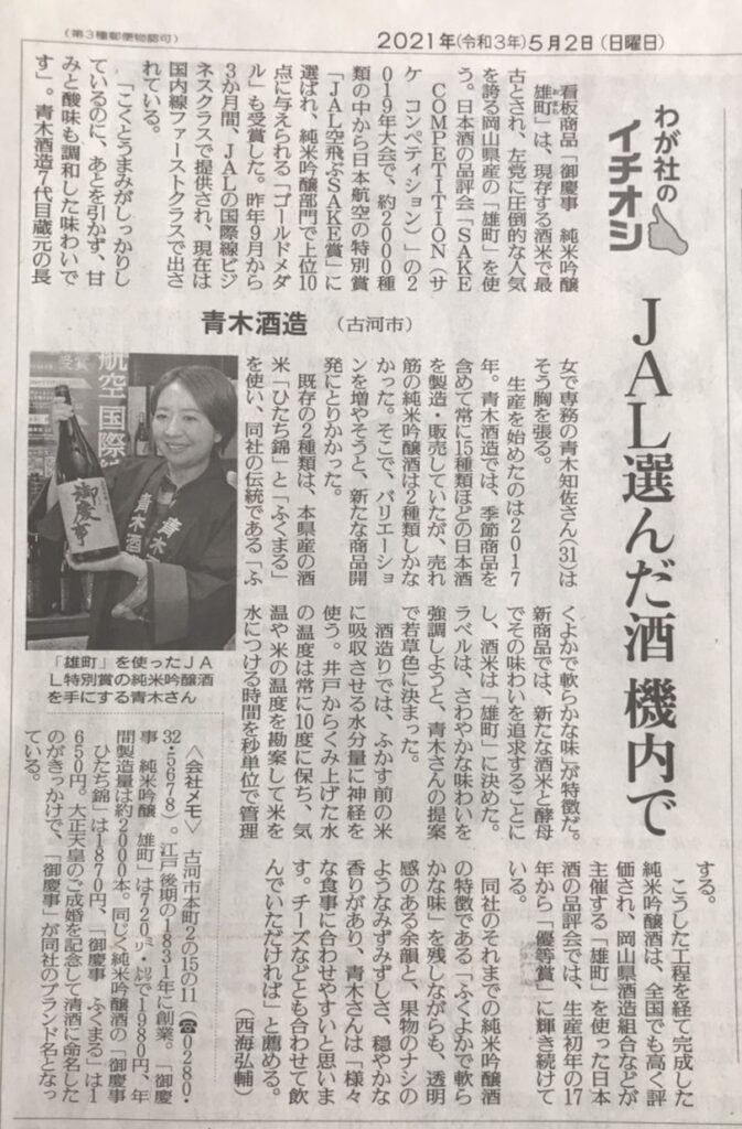 岡山県産「雄町」で醸された日本酒の出来栄えを競うコンテスト「雄町サミット」で3年連続優等賞を受賞、