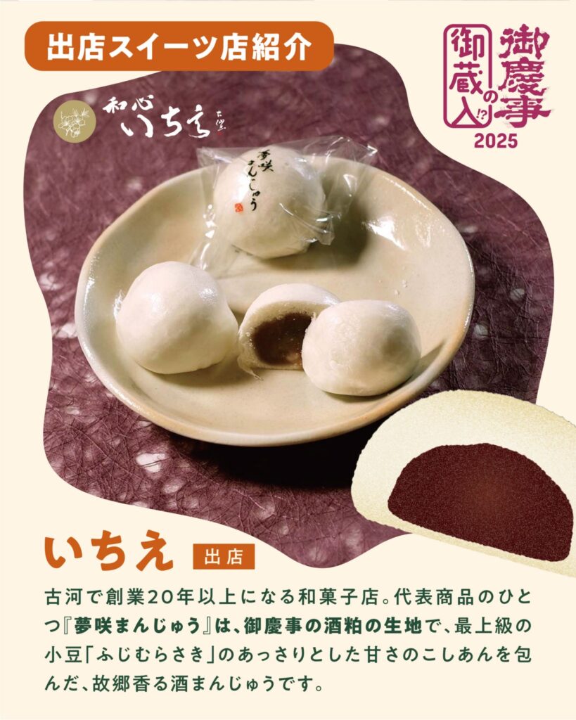古河で創業20年以上になる和菓子店。代表商品は当蔵の酒粕を使った「夢咲まんじゅう」。最上級の小豆・ふじむらさきのあっさりとした甘さのこしあんを包んだ酒まんじゅうを販売。